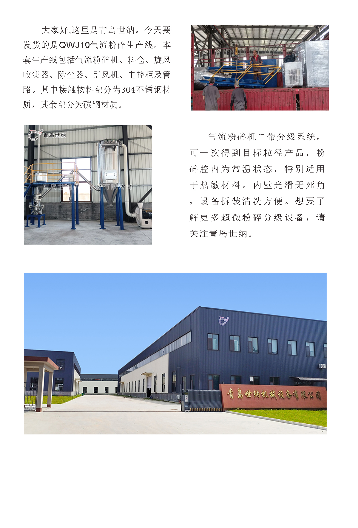 【青島www.17.com嫩草】QWJ10不鏽鋼氣流粉(fěn)碎生產線發貨現場